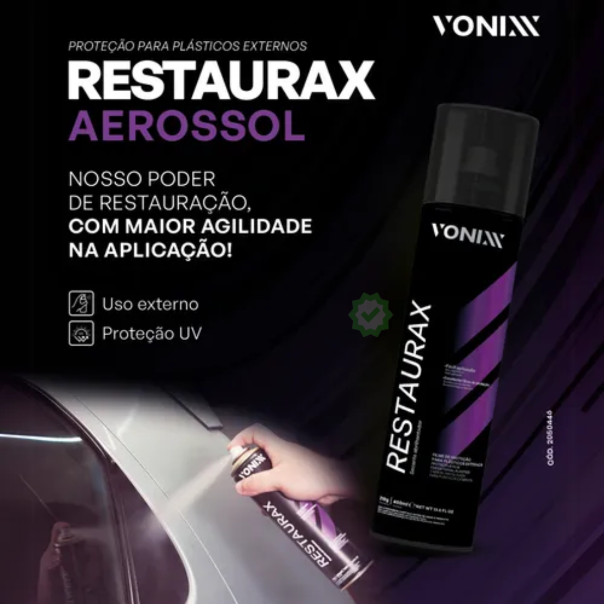 Agora disponível na versão em spray, o RESTAURAX Aerossol 400ml oferece a mesma alta qualidade e desempenho, ideal para restaurar e proteger superfícies plásticas como para-choques, painéis e laterais de portas. Sua fórmula especial proporciona brilho intenso e proteção duradoura contra os efeitos do tempo. Junto com o Aplicador de Espuma Vonixx, o produto garante aplicação uniforme e eficiente.