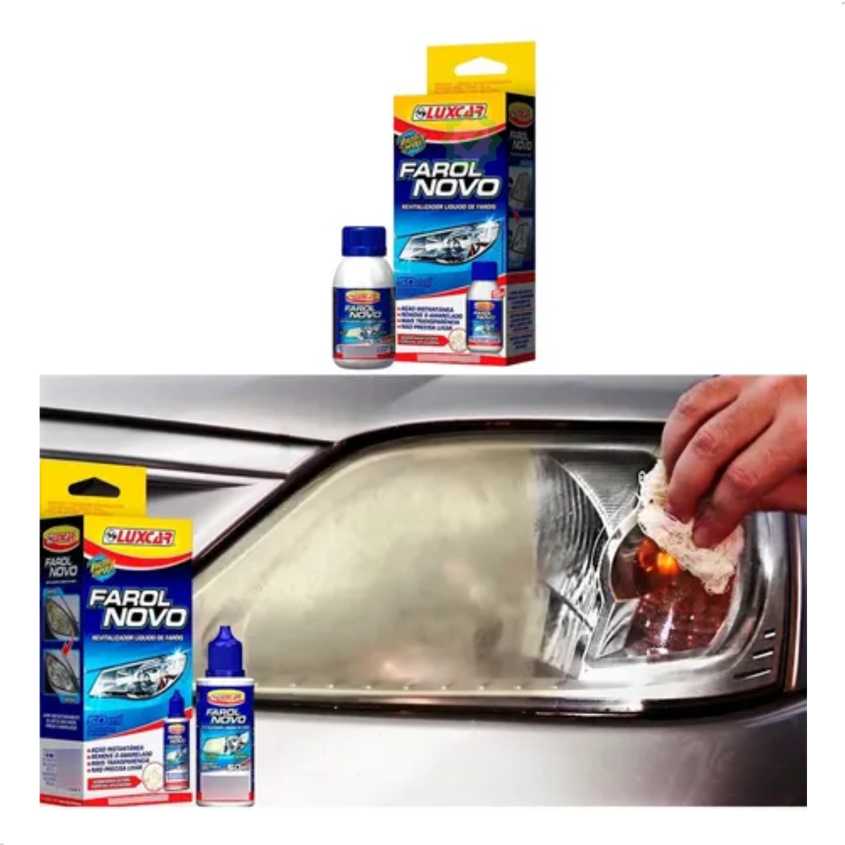 De ação instantânea, o Farol Novo Luxcar é muito fácil de usar, é só aplicar com auxílio de uma estopa e pronto, seu farol está novo em minutos e sem esforço.