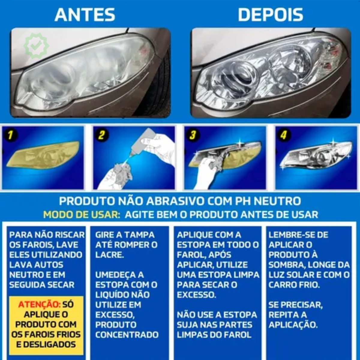 - Não utilize esse produto em faróis que foram restaurados e envernizados novamente.